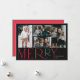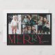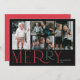 Estas simples tarjetas de felicitación con fotos de vacaciones incluyen el saludo "Merry", en grandes letras rojas y verdes sobre un fondo negro con marcadores de posición para agregar cuatro de tus fotos favoritas, nombre de familia y el año.