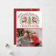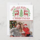 Tarjeta de Navidades de inspiración escandinava con dos renos rojos, un árbol verde de vacaciones y elegantes acentos de desplazamiento sobre la foto de tu familia. Personalizado con tu saludo, año y apellido, este diseño de arte folclórico rojo y verde crea un ambiente cálido y tradicional. Perfecto para compartir los deseos de vacaciones con amigos y familiares mientras muestra su foto favorita.