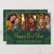 Tarjeta de foto de Feliz Año Nuevo verde y dorado caprichosa. Esta elegante tarjeta de vacaciones presenta un hermoso "Feliz Año Nuevo" caligráfico moderno y un elegante collage de tres fotos. Una plantilla de diseño festivo pero moderno para compartir tus recuerdos favoritos.