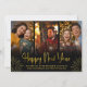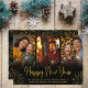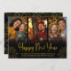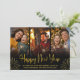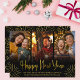 Extraordinaria tarjeta de fotos Black and Gold Happy New Year. Esta elegante tarjeta navideña presenta una bella caligrafía moderna "Feliz Año Nuevo" y un elegante collage de tres fotos. Una plantilla de diseño festivo y moderno para compartir tus recuerdos favoritos.