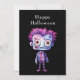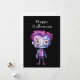 Feliz tarjeta de Halloween con un lindo ilustracion. Monstruo Frankenstein con pelo rosado y púrpura y traje y corbata de dapper.