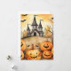 Tarjeta de Halloween con un ilustracion acuarela de una mansión embrujada, murciélagos y jack o’lanterns. Personalice fácilmente esta tarjeta acuarela de Halloween con su nombre y texto familiar.