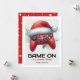 Gaming kids classroom christmas cards featuring a simple white & gray background, a red games controller wearing a santa hat, with the pun greeting "game on it's christmas", and the childs name at the bottom.