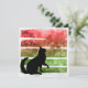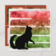 Gato de Navidad, bandas de rojo y verde brillante en tarjeta plana de fiestas - Un gatito negro de Navidad está mirando un lazo grande y bonito. Cinco bandas de color están detrás del gato con pequeños puntos brillantes que enfatizan la magia de la Navidad. Detrás de todo eso hay otra capa brillante en gris claro y blanco. La parte posterior de la tarjeta plana tiene espacio para que coloques 4 de tus propias fotos. Si decides no usar las fotos, puedes eliminar todo y seguirá habiendo un fondo brillante. Felices Fiestas de Kristin y Steve de KNS Christmas.