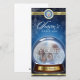 Saludo de temporada sobre fondo azul, agrega tu foto dentro del globo de nieve y tu nombre familiar. Recorte de oro en la parte superior e inferior y "Familias en el precinto de derechos"