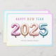 Tarjeta moderna de Año Nuevo 2025 con globos de papel de aluminio coloridos y la opción de agregar su mensaje personalizado en la parte posterior de la tarjeta.