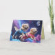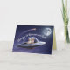 A Valentine's Day card featuring a Golden Retriever couple in a flying saucer going to the moon.