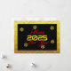Greeting wish card Happy New Year written in English in red and yellow font with snowflakes on a golden and black background - editable text and background