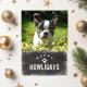 ¡Llamando a todos los amantes del perro! Envíe saludos "Felices Howlidays" a sus amigos y familiares con la foto de su perro en la parte delantera y el saludo de su personalizado en el interior. La parte delantera cuenta con un ilustracion de tipografía de época "Happy Howlidays" colocado sobre un fondo de pizarra negra enmarcado por un borde nevado. El interior dice "Que el Año Nuevo te traiga muchos Abrazos y Tratamientos (fácilmente editables). ¡Una tarjeta de vacaciones festiva que seguramente difundirá las vacaciones (día de la fiesta)!