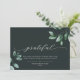 Stylish, elegant script calligraphy business holiday card reads GRATEFUL alongside modern eucalyptus watercolor illustrations, your custom text and message. On the back is space for another message and your corporate logo.