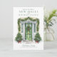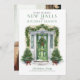 We're decking new halls for the Holidays Card. Christmas Moving Announcement photo Card. Favorite family photo on the back. Design features a watercolor green door decorated with pine wreaths and trees, snow, and red bows. Holiday we moved and have a new address photo card.