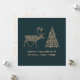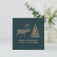 Green greeting card wishing a HAPPY HOLIDAYS & JOYFUL NEW YEAR written in English with a Christmas tree and a reindeer in gold with stars and Christmas balls - editable text and background