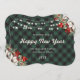 Elegant green buffalo plaid New Year card featuring a watercolor painting of poinsettia, holly and red berries along with string lights on a green and black buffalo plaid background. Easily personalize online.