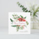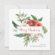 Elegante carta de Navidad de Verdor. Esta hermosa tarjeta cuadrada de Navidades cuenta con elegantes flores de color rojo acuático con bayas, pinecones y vegetación sobre fondo blanco con una 'Feliz Navidad' en un elegante guión escrito a mano | caligrafía. La parte posterior de la tarjeta incluye un patrón de coincidencia. Buscar elementos coincidentes en la colección Navidades botánicos de invierno rojo de vacaciones.