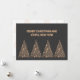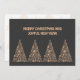 Greeting wish card Merry Christmas and Happy New Year written in English in gold font with Christmas trees with balls and stars on a grey background - editable text and background