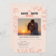 Celebre el amor con estilo con esta elegante tarjeta de invitación de boda "Save the Date", que presenta un borde floral romántico, una foto personalizable de la pareja al atardecer y tipografía elegante. El suave fondo rosado y los detalles botánicos crean una estética refinada y moderna, perfecta para anunciar su gran día.