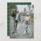Carta de vacaciones moderna y de moda con tu foto vertical de sangre completa en la parte delantera con "Feliz Navidad" en un sobre de escritura blanco con letras a mano. Personalice la parte delantera de la simple tarjeta de vacaciones añadiendo su nombre y el año. La tarjeta de vacaciones se revierte para presentar un fondo de manto verde pintado con espacio para fotos y texto adicionales.