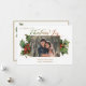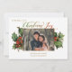 Guión de caligrafía personalizado "Alegría navideña" gráfico verde y rojo con campos de texto y borde de acebo vintage con ribete dorado para tu foto navideña. La parte trasera cuenta con una foto adicional, acebo y borde dorado. Todos los elementos son editables.