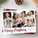 Tarjeta fotográfica de vacaciones moderna con 5 fotos favoritas dispuestas en forma de collage. El saludo de su personalizado aparece en un elegante guión de vino tintado con el nombre de su familia y el año mostrado a la derecha. La carta se invierte para mostrar un patrón de copo de nieve blanco y de vino.