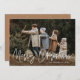 Tarjetas fotográficas de vacaciones modernas con tu foto horizontal con "Feliz Navidad" mostrada en un guión escrito a mano en blanco. Personalice la tarjeta de Navidades de fotos con su apellido y el año. La única tarjeta de vacaciones fotográfica se invierte para mostrar un fondo marrón caramelo con puntos blancos sutiles.