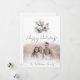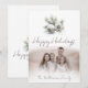 Una carta sencilla y elegante para las vacaciones. Hermoso guión deseando a la familia y amigos Felices Fiestas. Una gran foto de la familia enmarcada suavemente por bordes borrosos blancos. En la parte trasera - "Feliz año nuevo". Un ilustracion minimalista de acuarela de pinos nevados ocupa el centro del escenario en esta elegante carta de navidades modernos.