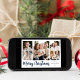 Tarjeta fotográfica de vacaciones moderna con 5 fotos favoritas dispuestas en forma de collage. El saludo de su personalizado aparece en un guión elegante de la marina con el nombre de su familia y el año mostrado a la derecha. La tarjeta se invierte para mostrar un patrón de copos de nieve blanco y de marina.