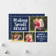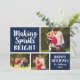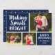 El diseño de la tarjeta fotográfica horizontal de vacaciones presenta un fondo azul marino (se puede personalizar) y elegantes letras de guiones roscadas "Making Spirits Bright". Personalice el texto del personalizado con el nombre y el año de su familia y agregue sus tres (3) fotos favoritas a la plantilla de collage de fotos. En la parte posterior de la tarjeta aparece un patrón de puntos nevados blancos. Fotografía © Storytree Studios, Stanford, CA