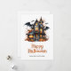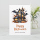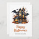 Tarjeta de Halloween con una casa embrujada, murciélagos, calabazas y un fantasma esqueleto con una linterna de jack o'lantern. Personalice fácilmente esta tarjeta acuarela de Halloween con su nombre y texto familiar.