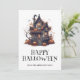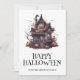 Hermosa tarjeta de Halloween con una casa embrujada y calabazas. Personalice fácilmente esta tarjeta acuarela de Halloween con su nombre y texto familiar.