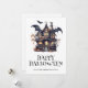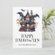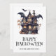 Hermosa tarjeta de Halloween con una casa adornada, calabazas y murciélagos. Personalice fácilmente esta tarjeta acuarela de Halloween con su nombre y texto familiar.