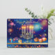 Happy Hanukkah Beautiful Jewish Holiday Greeting Card / Invitation. Jewish Holiday Hanukkah Vintage Jerusalem gold frame, navy blue background with traditional Chanukah symbols - Gold Menorah, Hanukkiah Candelabrum and Candles, wooden dreidels (spinning top), donuts, star of David and glowing lights wallpaper pattern. Hanukkah Festival Decoration. Jerusalem, Israel. Invitations & Stationery > Greeting Cards > Holiday & Seasonal Cards > Hanukkah Cards beautiful card with two sides graphic decoration. Card Design with custom text template. Vintage design. Personalize them by adding or change invitation text.