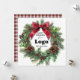 Custom "Happy Holidays" cards for customers and employees with your business logo, a festive wreath, a red bow, and a festive tartan plaid pattern on the back. Company promotional supplies for Christmas.