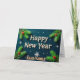 A festive top-down flat lay design featuring “Happy New Year” crafted in textured, golden 3D lettering on a dark, richly textured background. Lush green fir branches and bright red berries frame all four corners, creating a balanced, sophisticated holiday composition. Soft, diffused lighting enhances the depth of the golden text and the scattered white snowflakes, ranging from tiny dots to delicate, detailed shapes. With its elegant color palette of deep greens, gold, and subtle red accents, this artwork is perfect for New Year cards, posters, home décor, invitations, or celebratory seasonal products on Zazzle.