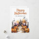 Carta feliz de Halloween con ilustraciones acuarelas de una mansión embrujada, murciélagos, jack o'lanterns y fantasmas. Personaliza fácilmente esta espeluznante tarjeta de Halloween con tu apellido y texto.