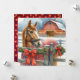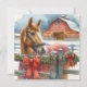 Tarjeta de Navidad personalizada con tema agrícola. Un bonito caballo marrón detrás de una vieja cerca de madera rústica adornada con lazos, guirnaldas y luces de Navidad. Al fondo hay un granero rojo.