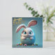 Esta tarjeta de Pascua está decorada con un lindo conejito, con orejas grandes, ojos grandes y una pequeña nariz rosada, saliendo de un huevo, en un estilo de película de animación. Está rodeado por unos huevos de color en diferentes tonalidades de rosa, azul, verde y amarillo. El mensaje feliz y festivo "Feliz Pascua" está escrito en letras doradas.