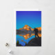 Stylized art of hiker overlooking Thousand island lake and Banner Peak at sunrise with "John Muir Trail" text. California, Sierra Nevada Mountains, Ansel Adams Wilderness, Thousand Island Lake. John Muir Trail Mile 044.
