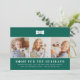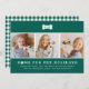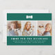 La tarjeta de Navidades "Hogar por las vacaciones", con el tema de nuestro perro mascota, incluye un collage de tres fotos cuadradas de tu nuevo cachorro para compartirlas con amigos y familiares. Personalice el texto con un saludo personalizado, su apellido o familia, el nombre de su cachorro y el año. El diseño moderno de color verde esmeralda incluye una tira de pata tibia, hueso de perro y un patrón coordinado de chapa gingham/búfalo en la parte posterior.