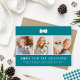 La tarjeta de Navidades "Hogar por las vacaciones", con el tema de nuestro perro mascota, incluye un collage de tres fotos cuadradas de tu nuevo cachorro para compartirlas con amigos y familiares. Personalice el texto con un saludo personalizado, su apellido o familia, el nombre de su cachorro y el año. El diseño azul verde azulado moderno incluye una tira de pata tibia, hueso de perro y un patrón coordinado de trenzas gingham/búfalo en la parte posterior.