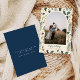 Una tarjeta de vacaciones moderna tu foto favorita en forma de arco con un patrón de hojaldre y hojas de pino en verde y azul marino. Personaliza con tus nombres, foto y mensaje inverso.