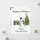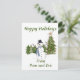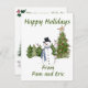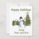 Tarjeta Festiva Hombre de nieve en pinos saluda fiesta navideña