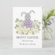 Envíe amor de Pascua y diversión con esta linda tarjeta de saludos moderna de Hoppy Easter, conejito de Pascua. Adorable conejo conejo de Pascua con un huevo de Pascua de manchas rosadas y violetas sentado en flores de primavera y follaje. Añade tu nombre de familia y saludos de Pascua en escritura a mano usando las plantillas fáciles de usar. Sencilla margarita y vegetación de eucalipto con minimalista ilustracion conejito, obra de la artista Catherine Sweetman