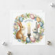 La imagen muestra un bonito ilustracion con temática de Pascua. Cuenta con dos conejillos situados uno frente al otro, con una vela encendida en el centro. Los bungalows están rodeados por una distribución circular de huevos de Pascua de color pastel, flores y follaje verde. Encima de la vela, el texto "Feliz Pascua" está escrito en un estilo curvo.