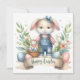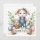 Este es un adorable ilustracion con temática de Pascua que presenta un lindo conejo vestido con overoles de denim y una camisa a rayas. El conejo está adornado con un arco azul en la cabeza, lo que le da un encanto especial. Posee una pequeña cesta de mimbre llena de coloridos huevos de Pascua. Alrededor del conejito hay flores de primavera, hojas verdes y huevos de Pascua decorados más grandes. Debajo del conejo, hay un cartel con las palabras "Feliz Pascua" escrito en un elegante guión. El estilo general es cálido, alegre y perfecto para las celebraciones de Semana Santa.