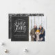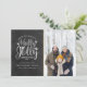 Diseño de tarjeta de fiesta con foto Holly Jolly con estilo para personalizar con tu foto, mensaje, nombres y año preferidos en un fondo de pizarra. La parte posterior presenta copos de nieve que caen sobre un fondo de pizarra correspondiente. Diseñado por Thisisnotme©