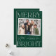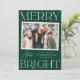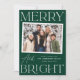Tarjeta fotográfica de vacaciones moderna con tu foto horizontal bordeada por un marco fotográfico instantáneo blanco. La frase "Merry and Bright" se muestra en letras blancas con un fondo verde festivo. Personalice la parte delantera de la tarjeta de vacaciones de la instantánea con el saludo del personalizado, el nombre de la familia y el año. La tarjeta vuelve a una foto adicional y un fondo verde con puntos blancos sutiles (nieve).