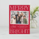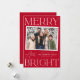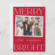 Tarjeta fotográfica de vacaciones moderna con tu foto horizontal bordeada por un marco fotográfico instantáneo blanco. La frase "Merry and Bright" se muestra en letras blancas con un fondo rojo festivo. Personalice la parte delantera de la tarjeta de vacaciones de la instantánea con el saludo del personalizado, el nombre de la familia y el año. La tarjeta vuelve a una foto adicional y un fondo rojo con puntos blancos sutiles (nieve).