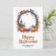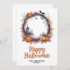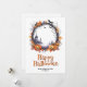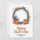 Carta feliz de Halloween con un ilustracion acuarela de una corona adornada con lámparas de jack o’lanterns, hojas y murciélagos. Personaliza fácilmente esta tarjeta de Halloween con tu nombre y texto familiar.