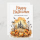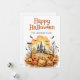 Carta feliz de Halloween con ilustraciones acuarelas de murciélagos, jack o’lanterns y fantasmas. Personaliza fácilmente esta tarjeta de Halloween con tu nombre y texto familiar.