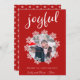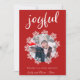 Joyful Red Script Snowflake Frame Photo Holiday Card. Diseño de vacaciones de invierno con una foto rodeada de hermosos copos de nieve blancos. El fondo es rojo con un patrón de copos de nieve. Añade tu foto y personalizar el mensaje y los nombres.